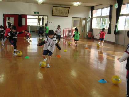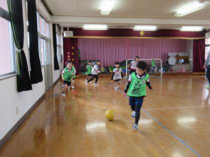 カターレの講師の先生が来園され、サッカー教室を行いました。何度か来ていただいているのですが、子供たちは「今日はどんな楽しいことをするのかな」「たくさんシュートするぞ」とワクワクがいっぱいです。ボールと仲良くなれるようにいろいろな技を学び、楽しんだ後は、4チームに分かれてゲームをしました。自然とキーパーと攻撃する選手に分かれて、連携して声をかけながらしていました。この中から将来、ワールドカップに出る子がいるかな…。楽しみですね!
