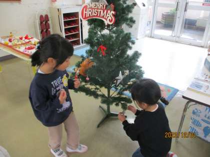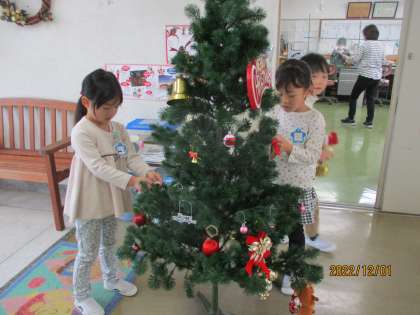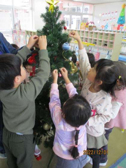 12月を迎え、今日は登園後からクリスマスツリーを飾りました。「サンタさん来てくれるかな」とクリスマスを楽しみにしている子供たちです。ツリーのライトを着けると「わぁ〜!きれーい」と喜んでいましたよ。