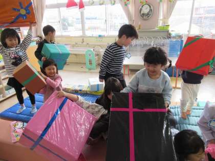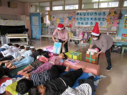 「サンタさんになって遊びたいね」「大きなベッドがあったらいいんじゃない」という話から、ばら組にみんなで大きなベッドをつくり、サンタごっこが始まりました。大きなベッドに横になり、寝ているところに鈴の音が聞こえてプレゼントを持ったサンタ先生が登場!目覚めるとたくさんのプレゼントに大興奮で「こんなに大きなプレゼントが届いたよ」「中は何が入っているのかな」と友達と見せ合いながら喜んでいました。この後も、しばらくサンタごっこが続きそうです。
