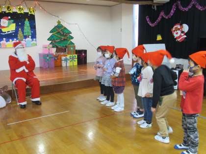 サンタさんに会えたら聞きたいことをそれぞれのクラスで考えており、もも組さんからは「どうして赤い服を着ているんですか」うさぎ組さんからは「サンタさんは何人いますか」ばら組さんからは「どうして夜に来るんですか」サンタさんに質問しました!どのような答えが返ってきたのか、またお子さんに聞いてみてくださいね!