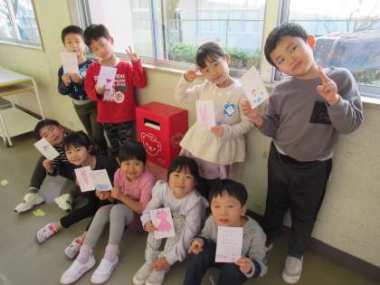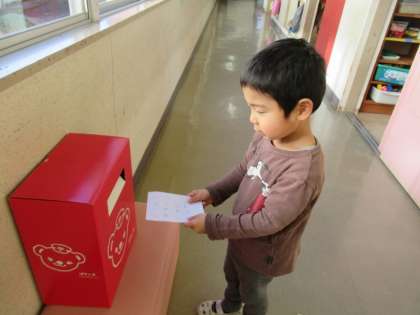 「幼稚園から年賀状が届いたよ」と教えてくれた子供たち。「幼稚園でもお友達に出したい」ということから、郵便ごっこが始まりました。年賀状の書き方、郵便番号が送り先によって違うことなどを知ると「そういえば、誰が配達するの」「それは、ばら組さんでしょう」と話し、うさぎ組さんやもも組さんに聞いて、郵便屋さんはばら組がすることに決まりました。早速、一人一枚年賀状を書き、ポストに投函しました。今か今かと届くのを楽しみにしています。