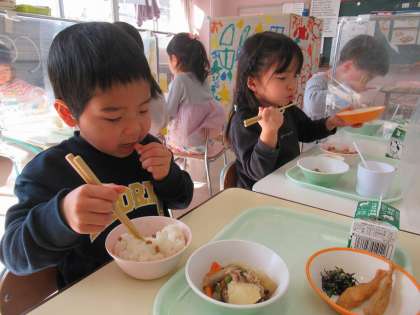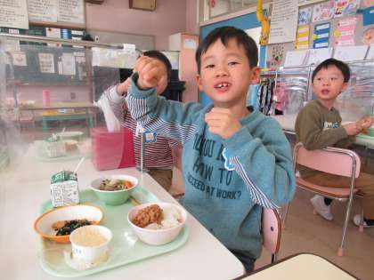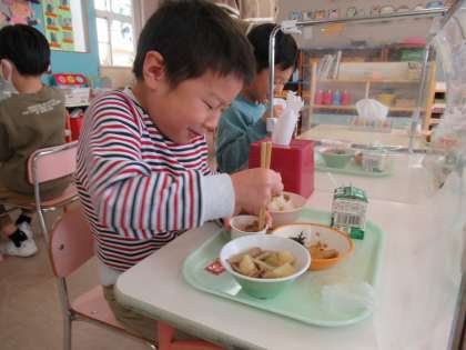 ねばねば納豆 公開日 2023/01/12 更新日 2023/01/12 楽しい月岡幼稚園ニュース 1月12日(木) 今日の給食は、納豆です。昨日から楽しみにしている子、食べたことがなくてドキドキしている子、ご飯にかけようかそのまま食べようかと考えている子と様々。醤油のたれの袋をそっと切るのに苦戦しながらも納豆にかけ、混ぜながら糸が引くのを面白そうに見ていました。納豆の糸と格闘しながらも、納豆のおかげかご飯はあっという間になくなりました(笑)