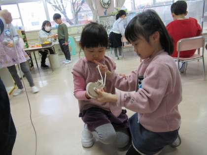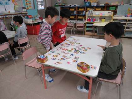 修了記念撮影が無事に終わり、全員がホッとしたところでこままわしに挑戦したり、かるた取りをしたりしました。こまに紐を掛けるには力加減やコツがあって、すぐに紐が寄れてしまってできないと諦める姿が見られるかと思いきや、何度も紐を掛けては直していました。こまの回し方が分からないと教え合ったり、かるた取りで負けて涙している友達に「次に頑張ろう」「今度したら勝てるかもよ」と励ましたりする姿に成長を感じました。郵便屋さんも毎日忙しそうに配達しています。