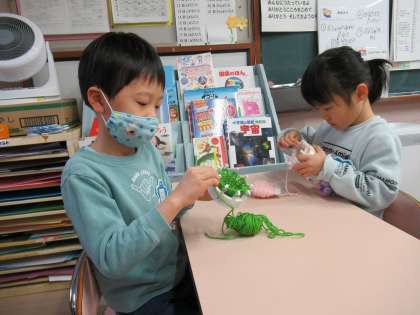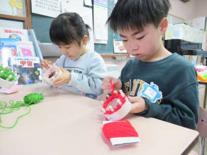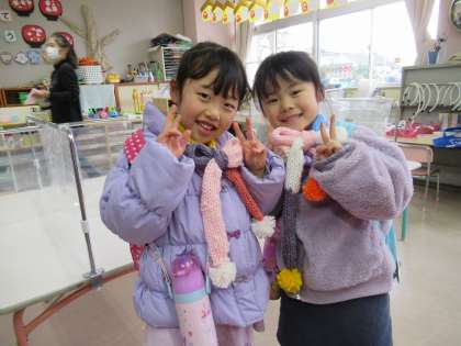 マフラーづくり(ばら組) 公開日 2023/01/19 更新日 2023/01/19 楽しい月岡幼稚園ニュース 1月18日(水) 朝晩寒い日が続き、首元が寒くなってきました。 いろいろな色の毛糸を準備すると「私、ピンクがいい」「青がかっこいいよね」と、マフラーづくりが始まりました。最初はやり方に慣れず苦戦していましたが、慣れてくると楽しくなってきて、みんなで没頭。友達と長さを競い合ったりして、一日でつくり上げてしまう子もいました。