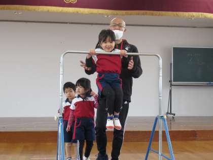 今日の体操教室はお家の方が来られ、鉄棒に挑戦する姿を見ていただきました。準備体操やストレッチが終わった後、鉄棒で足抜き回り腰抜き回り、つばめからの前回り、力持ち(鉄棒にぶら下がる)をしました。力持ちでは、やっている子供たちも周りで見ているお家の方や先生も応援に力が入りました。力持ちをすることで逆上がりができると聞き、講師の先生の支えはありましたが、全員が逆上がりをすることができました。寒くなると体も縮こまりがちですが、体を動かして遊びたいと思います。