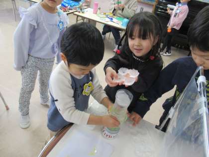 また、ここ最近ずっとテラスで卵のカップやトレーに水を入れて、氷の実験をしていたのですが、ついに今日氷になっていました!嬉しくてばら組やもも組、園長先生に見せに行く子供たちでした。ペットボトルに入っていた水がすべて凍り、面白い形の氷ができた子もいました。触っているとどんどん溶けてしまい「もう一回凍らせよう」ともう一度実験をしたり「お花も水と一緒に入れたら、どうなるかな」と試す姿も見られましたよ。