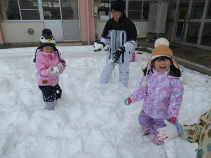 園庭にたくさん雪が積もったので、子供たちのずっと楽しみにしていた雪遊びを思いっきり楽しみました。雪合戦をしたり、雪のベッドに寝転んだり、それぞれに友達と遊んでいました。雪がふわふわで、雪だるまはつくれなかったので、次回また作りたいと思います。