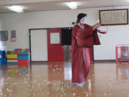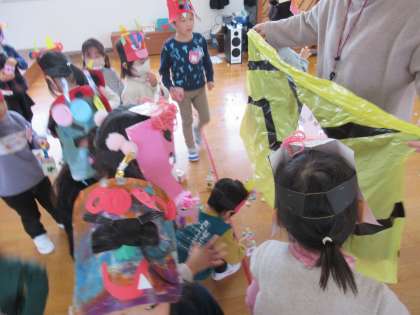 子供たちの心の中からの「鬼」が遊戯室にやってくるとはじめは怖がった子供たちも「鬼は外!」と力強い声でみんなで力を合わせて退治しました!子供たちの声に慌てて逃げ出していました!鬼が去ると福の神が登場し、ほっとする瞬間でした。福の神が去ったその先の廊下を見ると何やら大きなものが…慌てて逃げ出した鬼がパンツを忘れて帰りビックリ!「あわてんぼう鬼だったね」と怖さよりパンツの落とし物が印象に残ったかな?
