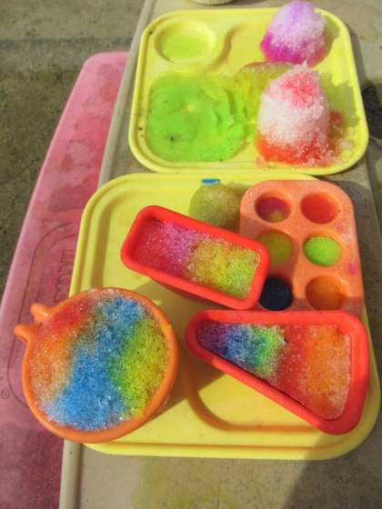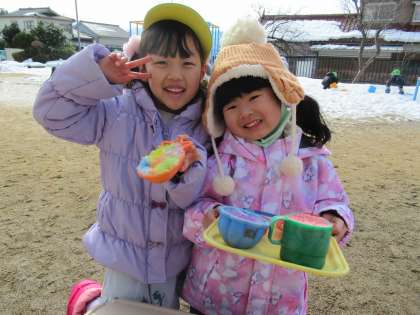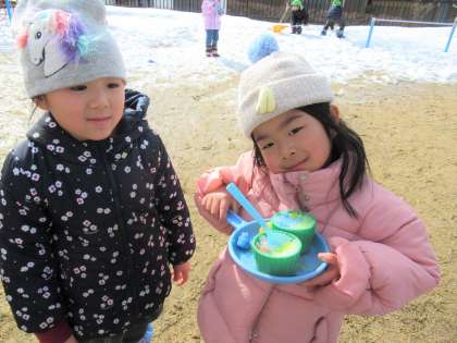 雪遊び楽しいね!(うさぎ組) 公開日 2023/02/13 更新日 2023/02/13 楽しい月岡幼稚園ニュース 2月7日(火) 今日も雪遊びをして遊びました。今日は砂遊びの型抜きを使って、いろいろな食べ物をつくり、絵具で色塗りをして遊びました。すてきな色の料理がたくさん並びました。「レインボーレストランです!いかがですか?」と友達と楽しんでいました。