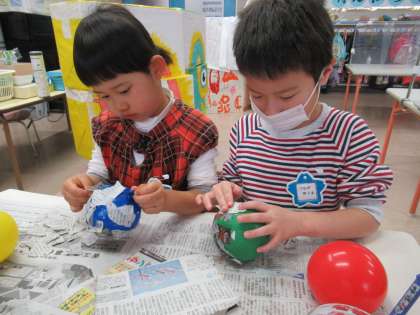 お雛様を張り子でつくろうと思い、子供たちと一緒に取り組みました。風船にのりを塗って、細かくちぎった新聞紙を貼っていくのですが、これが大変な作業で、最初はコツがつかめずに悪戦苦闘。どれくらいのりを塗ったらいいのか、新聞紙は何回ぐらい重ねたらいいのか等考えながら、丁寧につくっていきました。お内裏様とお雛様の分で2個。やっていくうちにコツをつかみ、きれいに貼ろうと真剣にしていました。
