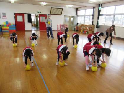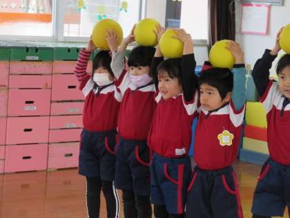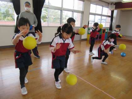 体操教室(うさぎ・ばら組) 公開日 2023/02/14 更新日 2023/02/14 楽しい月岡幼稚園ニュース 2月14日(火) 今日の体操教室は、ボールでした。ボールを使っていろいろな技に挑戦し、楽しみながらボールと触れ合い、扱い方を教えてもらいました。最後には、両手でボールをキャッチするところから始まり、キャッチする前に両手で頭を触ってからキャッチする、次は両手で頭、肩を触ってからキャッチすると、レベルが上がるごとに難しくなり、真剣に取り組んでいました。
