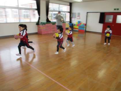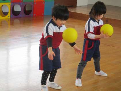 ボールをいろいろな持ち方で持って走ったり、ボールを床についてとることや上に投げてキャッチすることを教えてもらったりしました。ボールを上に投げてとるのは難しいようでしたが何度も挑戦していました。