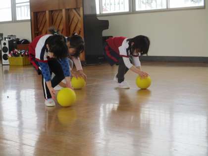 今日の体操教室はボールでした。準備体操には「勇気100%」を踊り、先生の動きを見ながら踊るのも上手になりました。