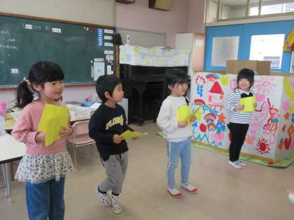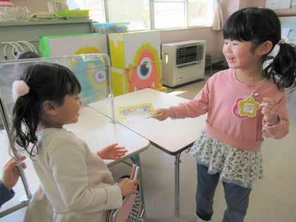 2月から、お別れ会の準備を少しずつ進めてきましたが、いよいよ当日まで残り7日になりました。今日は、ばら組さんに招待状を渡してきました。ずっと渡したくて仕方がなく、招待状を渡すときもばらさんの反応を楽しみに見ていました。いざ、ばら組さんに招待状を渡すと、とても喜んでくれたので「大成功だったね!!」とうさぎ組の子たちは大喜びでした。最近は司会の練習も頑張っている子供たちです☆