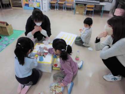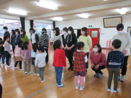 今年度、最後の保育参観がありました。それぞれのクラスで好きな遊びを楽しんだ後、親子でドッジボールをしました。なかなか親子でドッジボールをする機会はないと思うので、子供たちも大喜びで、いつもよりも気合が入っていたように思います。お母さんたちと同じチームになると、嬉しそうに近くにいる姿や、外野にいるお母さんにボールをパスして連携する姿も見られたのが印象的でした。