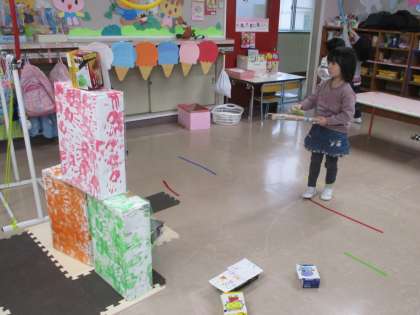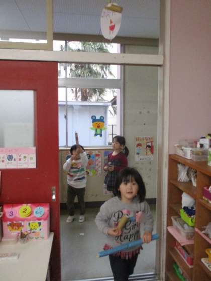 今日は保育自由参観がありました。子供たちが「鬼でポン」と呼んでいる新聞紙の土台とトイレットペーパーの芯を飛ばして遊ぶ遊びや、おすし屋さんを楽しみました。子供たちは好きな遊びを見付けて遊んだり、友達や保護者の方とやり取りを楽しんだり楽しい時間を過ごしました。この一年での子供たちの成長を見ていただく機会となったのではないかと思います。ご参加くださりありがとうございました。