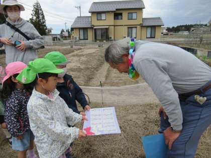 今日は園の近くで畑をされている地域の方に会いに行ってきました。2学期のサツマイモの収穫前の時期に散歩に出かけたときにお会いし、サツマイモの育て方や種芋のつくり方等、丁寧に教えてくださいました。子供たちはお礼をしたいともうすぐ修了を控えたばら組さんを中心に手紙を書き、うさぎ組、もも組の子供たちからも手紙や首飾りを渡しました。先週、ばら組さんが散歩に出かけたときに手紙を渡したいことを伝えていたところ、素敵なお返事をいただき、子供たちも喜んでいました。来年度も困ったことがあれば聞いてくださいという心強い言葉をいただきました。