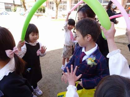 園庭では、年中組、年少組から「修了おめでとう」「元気でね」「また、幼稚園に遊びに来てね」と風船のアーチで見送ってもらいました。嬉しそうに晴れやかな素敵な笑顔で巣立っていきました。