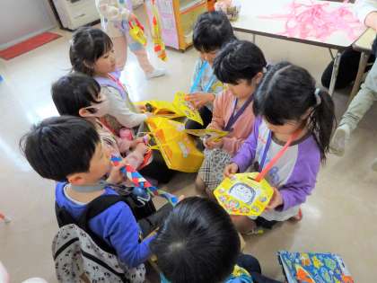 また、月刊誌の付録に付いていた「1年間がんばったことカード」をみんなで完成させました。「私こんなにできるようになったことあるんだ!」「みんなに教えてこよう!」と大きくなったことが嬉しくて、もも組さんや先生方に見せに行っていましたよ。次はいよいよばら組さん!楽しみですね。うさぎ組さんと過ごす1年間は本当に楽しい日々でした。ありがとうございました。