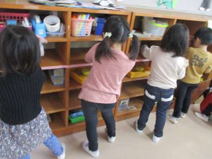 修了式後は、月刊誌の付録「できたよカード」を見ながらできるようになったことを子供たちと一緒に喜び合いました。1年前は初めての集団生活で不安や緊張もあったであろう子供たちもこの1年でできるようになったことが増え、うれしい成長を感じています。また、保育室の掃除を子供たちと一緒にしました。「きれいなお部屋だと新しくもも組さんになるお友達、嬉しいね」と声をかけるとさらに張り切ってきれいに棚や椅子を拭いていました。