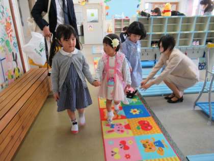 新しくもも組(3歳児)・うさぎ組(4歳児)になった友達が登園すると、ばら組(5歳児)のお兄さん・お姉さんが玄関で出迎え、手をつないで保育室まで案内してくれました。