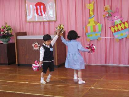 うさぎ組は、♪おめでとうを100回、ばら組は、♪ハッピーラッキーデラックスをポンポンを持って元気いっぱいに踊りました。