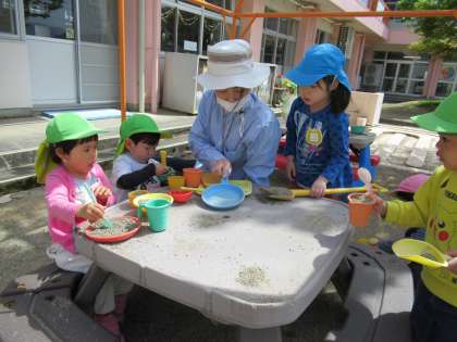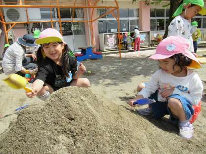 最初に園庭での約束事や遊具の使い方を知らせた後遊び始めたのですが、何故か全員が砂場に集まっていました。ごちそうや大きな山をつくり、友達と見せ合っていました。