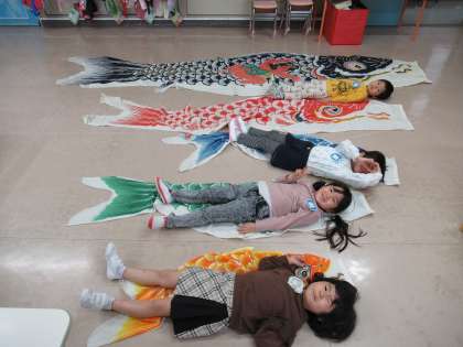 幼稚園の廊下にもこいのぼりが飾られ、大きなこいのぼりに目を奪われている子供たち。「僕たちと比べるとどっちが大きいかな」「こいのぼりのほうじゃない」と話していたので、実際にこいのぼりを並べ、背比べをしました。予想を超える大きさに「お父さんが一番だね」「オレンジのお姉さんこいのぼりは私と同じくらいかも」と、友達と比べて楽しんでいました。