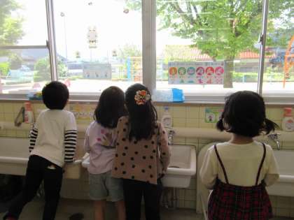 園庭で遊んでいるときに「皆さん、すぐにお部屋に戻りましょう」と放送が入ると、近くの先生の指示のもと、お部屋に戻りました。全員で光化学オキシダントの話を聞き、解除になるまでは園庭で遊べないこと、その印として黄色い旗が園庭に立てられていることを知り、様子を眺めていました。解除の放送が入ると、安心したようでした。