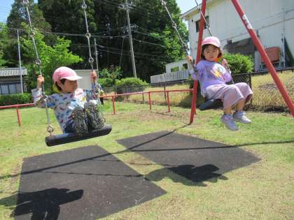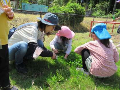 公園に着くと、まずは水分補給。その後、約束事をして遊び始めました。ブランコや滑り台で遊んだり、シロツメクサで花輪をつくることを教えてもらったりして過ごしました。昨年のドングリが今も残っていて、見付けると喜んでいました。
