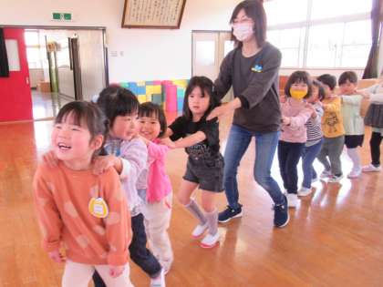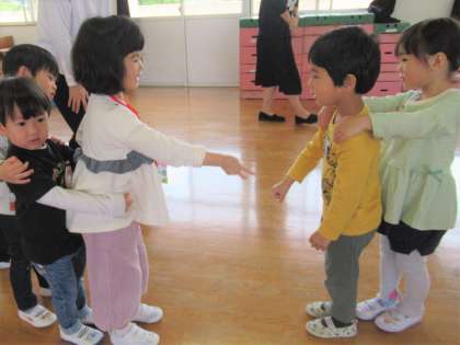 お楽しみコーナーでは、フルーツジャンケンのパネルシアターを使って、ジャンケン大会やジャンケン列車を楽しみました。ジャンケンに勝った友達の後ろに負けた友達がつながってだんだん長くなり、最後は一つの列車ができました。