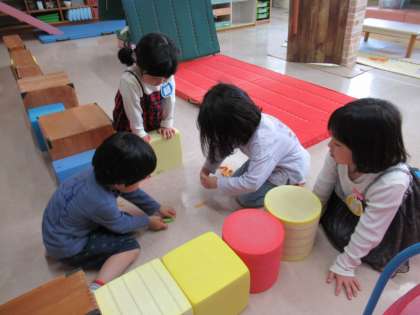 先日、帰りの会で「アブナイこうえん」という絵本を読むと「こんなところつくってみたい」「宇宙にしたら楽しいかもね」という話になり、みんなで相談してつくることになりました。何が必要か、どのような遊び場をつくりたいのか、一人一人が考え、みんなの前で伝えると「賛成」「それ、したいと思ってたんだよね」と話が盛り上がり、すぐに2階から必要なものを年長組まで運び、組み立てていきました。