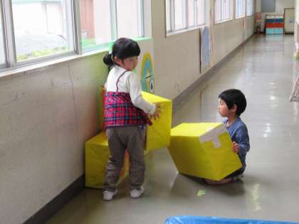 「違うよ。こっちがいいんじゃない」「私はこっちがいいと思う」とお互い意見が違い、遊びが進まなくなってしまうこともありましたが、少しずつ解決しながら形にしていきました。「小さい友達も誘って、一緒に遊びたい」とも話し、実際に遊びに来てくれると喜んでいました。今後も子供たちと話合いを重ねながら、楽しい遊びを自分たちの力でつくってほしいと思います。