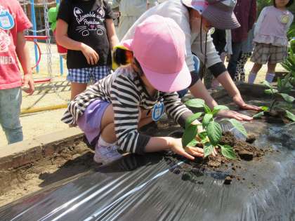 一人一つずつ苗を植えることに決まり、自分が植えたい野菜を植えました。風が吹いて倒れないように支柱の仕方も教えてもらい、来週から毎日水やりを頑張ろうと張り切っていました。