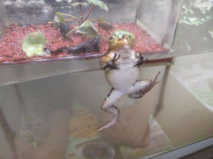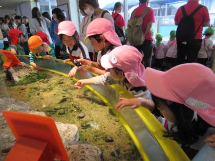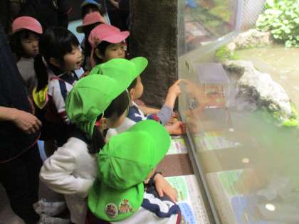 春の遠足(全園児)2 公開日 2023/05/22 更新日 2023/05/22 楽しい月岡幼稚園ニュース 水槽にくっついているカエルを発見!「ここにもカエルおったよ」と覗き込みました。この他にもいろいろな種類のカエルを見付けたので、どのようなカエルがいたのか、またお子さんに聞いてみてくださいね。 ばら組さんはふれあいコーナーでヒトデを触り「おっきいヒトデ」と喜んでいましたよ。