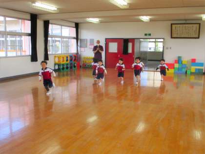 今日はもも組にとって初めての体操教室で、体操服で登園し、ワクワクした様子の子供たち。元気な声で「お願いします」と挨拶した後、準備体操の♪ハッピージャムジャム♪の曲で体を動かしました。
