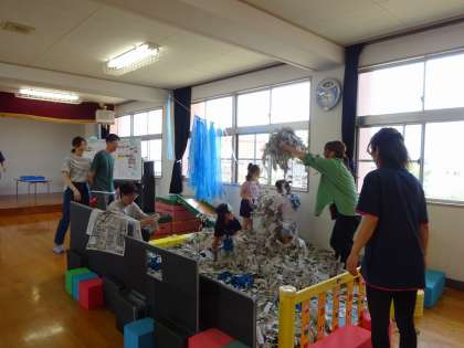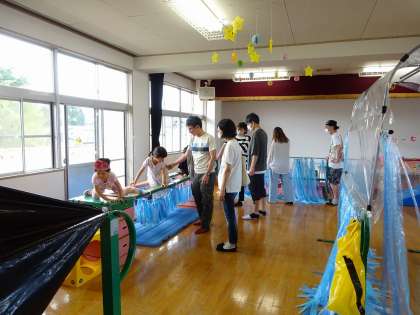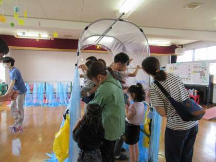 ゆらゆら橋やドキドキ橋、真っ暗公園、アイスクリーム屋さん、友達水槽(釣り)、ペンペンプールといろいろな遊び場を回りながら「ゆらゆらして楽しいよ」「真っ暗で怖いよ」「もっと水かけて」と親子での会話も見られ、普段の遊びの様子を見ていただけたのではないかと思います。