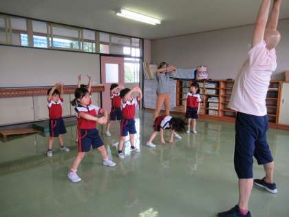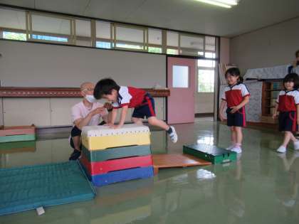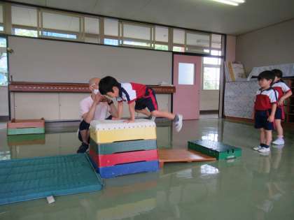 先生が「どうしたらできるようになるかな」と子供たちに質問されると「足を大きく開く」「何回も練習する」「手を(跳び箱の上に)ちゃんとつく」と話していました。それぞれに学んだことを生かして、遊びの中でも挑戦していけたらと思います。
