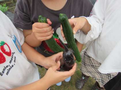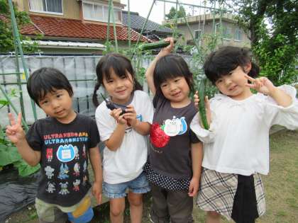 夏野菜 初収穫!(ばら組) 公開日 2023/06/19 更新日 2023/06/19 楽しい月岡幼稚園ニュース 6月16日(金) 苗を植えてから毎日水やりをし、生長を見守ってきた夏野菜がついに収穫の日を迎え、子供たちは大興奮でした。 初収穫は、キュウリが2本と茄子が1個。 収穫した野菜は、まずばら組で分けていき、その後うさぎ組→もも組→先生の順番に渡していきます。全員がもらったら再びばら組に戻るという形で、全員で収穫を喜び合えたらと話しています。 これからが楽しみですね。