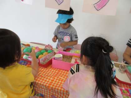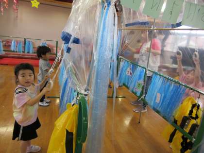 今日はばら・うさぎ組の友達が科学博物館へお出かけ。バスを見送った後「キラキラひかりの公園」で遊びました。大水槽の魚を動かしたり、アイスクリーム屋さんの店員やお客さんになったりしてもも組だけの時間を楽しんでいました。