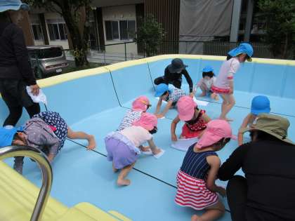 先日の保育参観で保護者の方々がプールを組み立ててくださり、子供たちも早く入りたいと楽しみにしてきました。