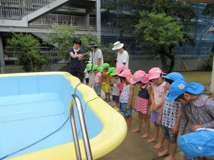 先日の保育参観で保護者の方々がプールを組み立ててくださり、子供たちも早く入りたいと楽しみにしてきました。