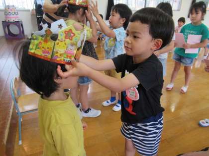 恥ずかしそうに入場してきた6月生まれのお友達。「好きなジュースは何ですか」「好きなお菓子は何ですか」と質問されると、考えながら答えていました。冠や誕生カードのプレゼントももらい、とても嬉しそうにしていましたよ。