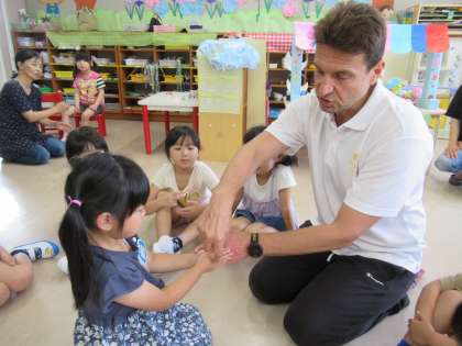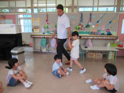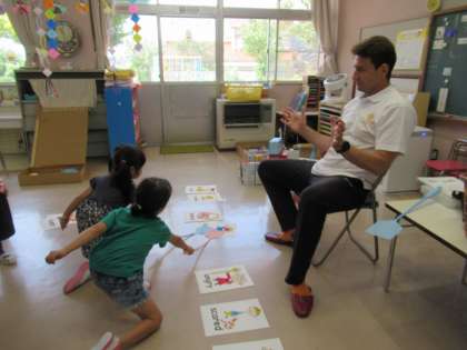 事前にダン先生から一枚ずつ絵カードを見ながら英語を教えてもらうと、次はダン先生の発音だけを聞いて、該当する絵カードを選びます。友達と競って取りに行くので、真剣さが増します。その後は、ハンカチ落としの英語バージョンの「ダック&グース」や手遊びもして、楽しく過ごしました。