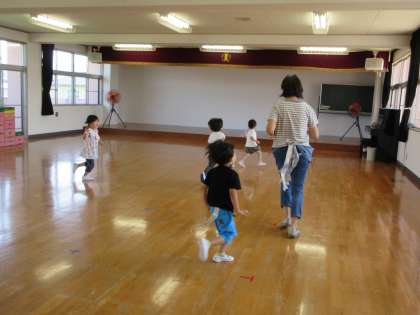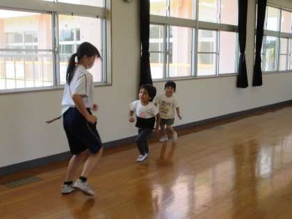 今日は遊戯室でしっぽ取りをしました。しっぽ取りが大好きな子供たち。しっぽを着けた先生たちを追いかけ、しっぽをとることを楽しんでいます。今日は14歳の挑戦のお姉さんも一緒で喜んでいました。