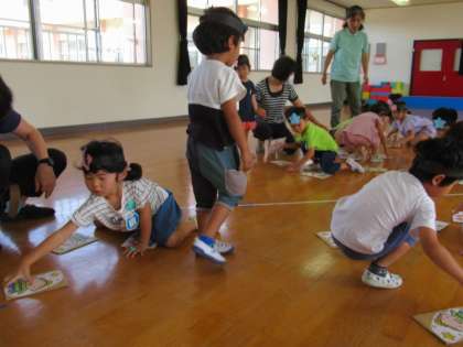 続いての「たからさがしゲーム」では、遊戯室や絵本コーナーなどに隠された星(たから)を探します。「どこにあるかな」「こっちにあるかも」と、あちこちで夢中になって星を探す声。「お星さまあった」「ここにもあった」と次々に見つけては大喜びの子供たちでした。