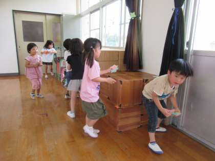 続いての「たからさがしゲーム」では、遊戯室や絵本コーナーなどに隠された星(たから)を探します。「どこにあるかな」「こっちにあるかも」と、あちこちで夢中になって星を探す声。「お星さまあった」「ここにもあった」と次々に見つけては大喜びの子供たちでした。