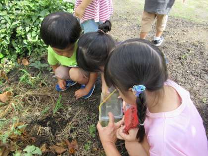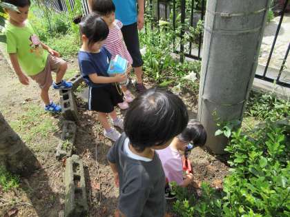 用務員さんが園で見付けたカマキリを飼育ケースに入れて観察したり、触れて遊んだりしていましたが、今日登園するとカマキリが動かなくなっていました。子供たちから「お墓つくろう」という声が聞かれ、園庭の片隅に埋めてあげることにしました。また、飼育していた、カタツムリとダンゴムシも夏休みに入るため、園庭に放してあげることにしました。「どこに帰してあげたらいいかな」と聞くと、ダンゴムシは「枯れた葉っぱの下」カタツムリは「濡れた葉っぱのところ」と経験から生き物の好きな場所を答える姿がありました。お別れするときには「バイバイ」と手を振る子供たちに心が温かくなりました。