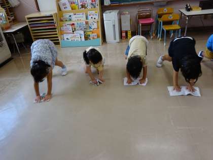 今日は1学期の終業式がありました。保育室では1学期にたくさん遊んだ生活の場の掃除をしたり、夏の過ごし方を聞いたりしました。また、園長先生から夏を元気に過ごすこと、早寝早起きすること、お家の人の手伝いをすること等話があり、約束をしました。