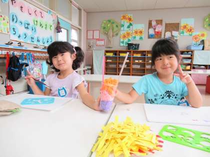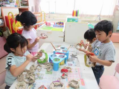 茶色の紙を利用してくるくると巻きながらドーナツをつくり、いろいろな色の絵の具から自分で塗りたい色を選んで模様付け。「チョコレートが美味しそう」「イチゴ味がいいんじゃない」「ブドウもいいね」と友達同士見せ合っていました。